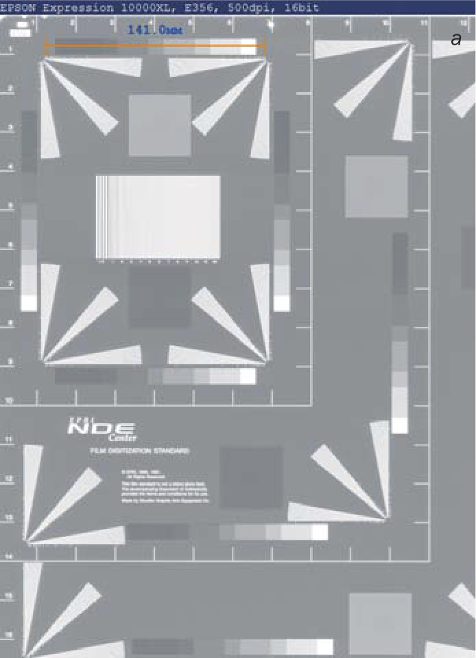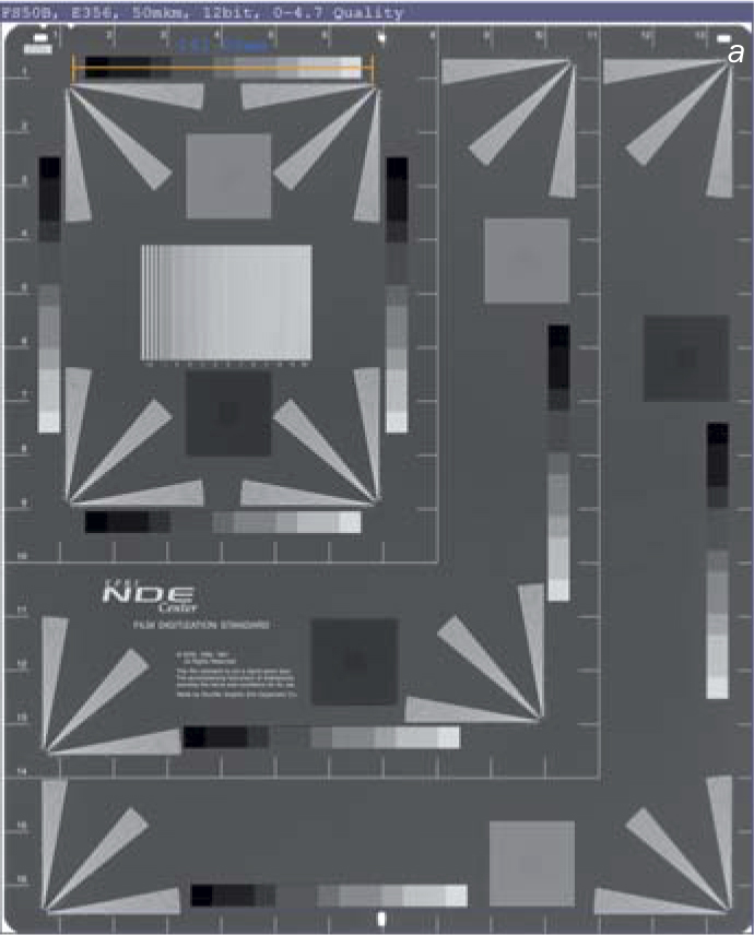 При подготовке данной статьи были исследованы характеристики сканеров FS50B производства компании GE Inspection Technologies и Epson Expression 10000 XL (модель J181A со слайд-модулем EU-88) по методике, описанной в п. 4.1 стандарта ISO 14096-1-2005. Сканер FS50B был выбран потому, что был аттестован в 2003 г. Федеральным институтом исследований и контроля материалов Германии (BAM) как соответствующий классу DS9 [3], а Epson Expression 10000 XL — как наиболее широко используемый в России несколькими производителями устройств для оцифровки радиографических пленок для целей НК.