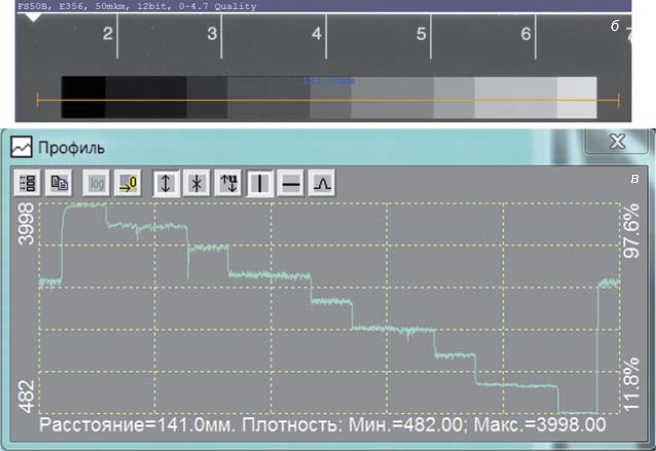Рис. 2 Цифровое изображение пленки EPRI E 356 со сканера FS 50В, размер пикселя — 50 мкм, глубина оцифровки — 12 бит, диапазон D – 0 – 4, 7, режим «Высокое качество» (а); изображение объекта Н в увеличенном масштабе (б); профиль распределения градаций серого вдоль объекта Н (в)