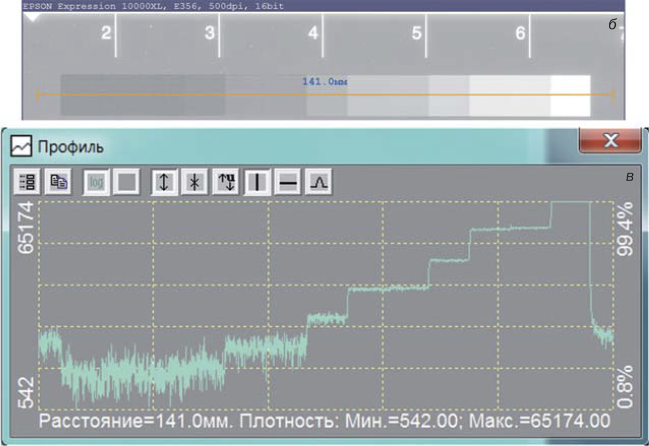 Видно, что качество изображений пленки Е356, полученных на обоих сканерах, заметно отличается, и при оптической плотности D > 2,0 для сканера Epson (рис. 3в) наблюдается резкий рост шума в оцифрованном изображении.