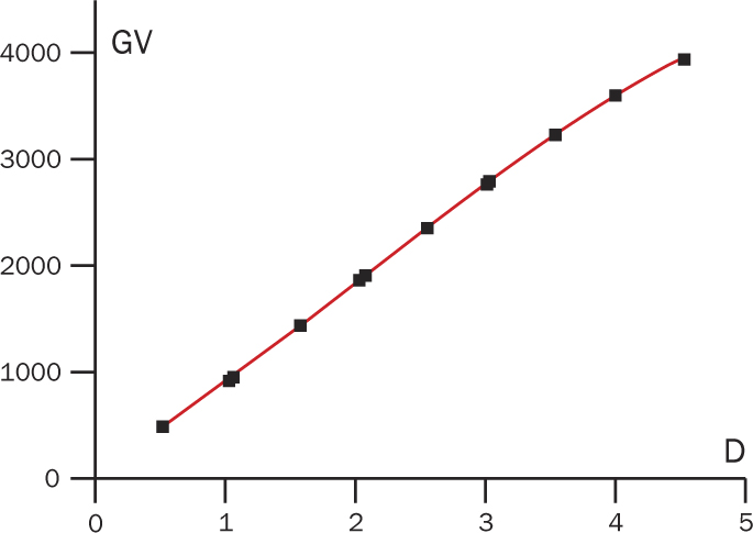 На рис. 4 и 5 показаны характеристические кривые преобразования оптической плотности в градации серого GV для сканеров FS50B и Epson. Значения GV рассчитывались по формуле 3 стандарта ISO 14096-1-2005 как среднеарифметические для выделенной области 15 × 15 пикселей в центре каждого из участков с калиброванной оптической плотностью объекта Н пленки Е356. Характеристические кривые для сканера FS50B получились одинаковыми для режимов «Высокое качество», «Стандарт» и «Высокая скорость» при прочих одинаковых условиях, указанных в подписи к рис. 4, поэтому на рис. 4 показана лишь кривая для режима «Высокое качество».