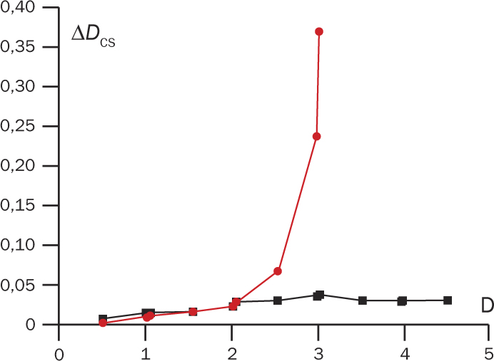 На рис. 6 для сравнения приведены зависимости контрастной чувствительности ∆Dcs от оптической плотности D для сканеров FS50B и Epson Expression 10000 XL. Видно, что в последнем случае при D > 2,0 резко ухудшается контрастная чувствительность из-за собственных шумов (см. рис. 3в), и его использование для целей цифрового архивирования пленок оказывается невозможным.