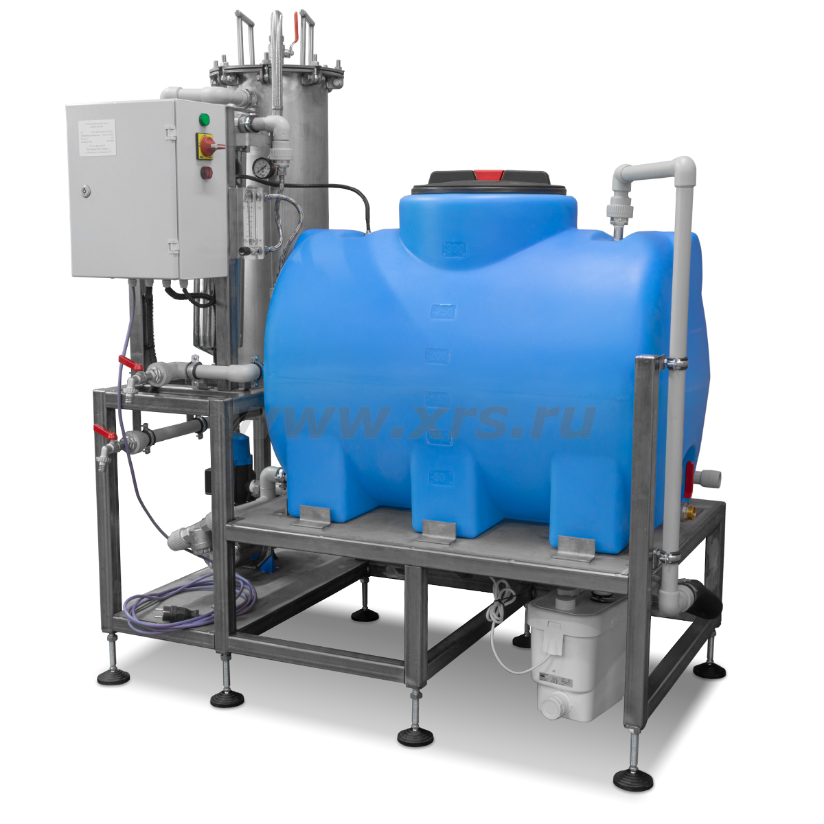 Установка фильтрации воды включает в себя накопительную емкость для отработанной воды, два угольных фильтра, накопительный бак для очищенной воды и две насосные станции. Компоненты установки размещаются на каркасной конструкции из нержавеющей стали.