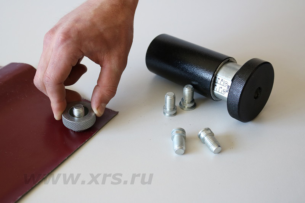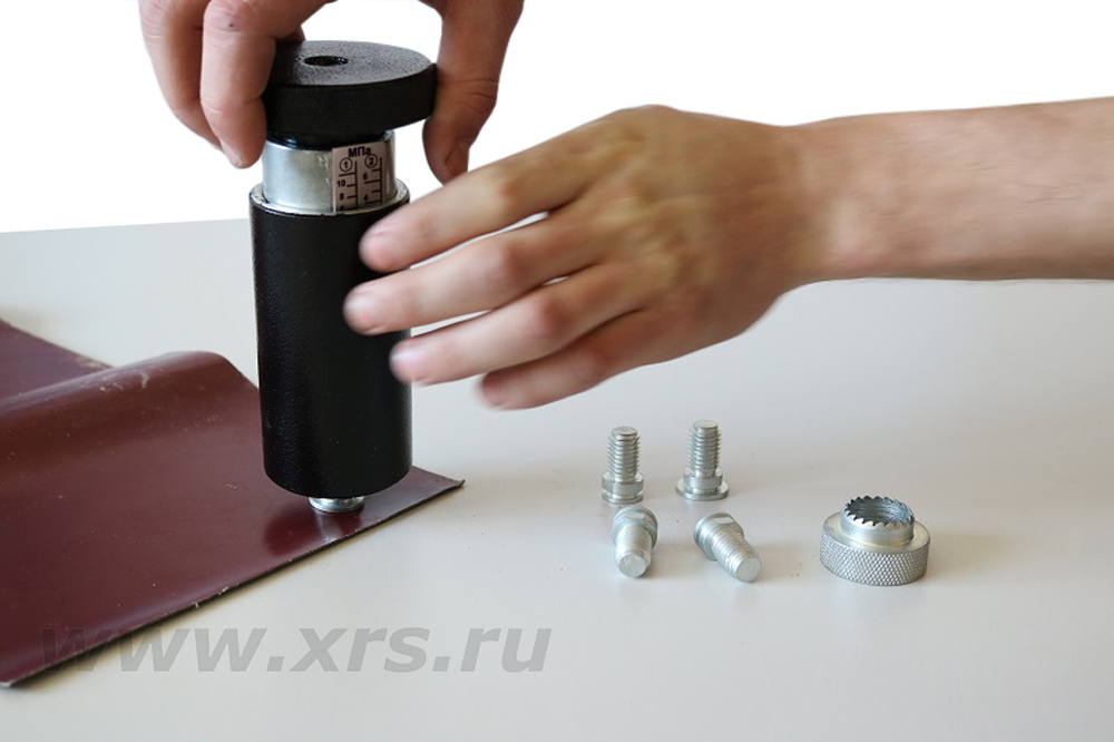 Принцип действия адгезиметра АМЦ-1 основан на измерении силы, требуемой для отрыва грибка, приклеенного к испытываемому покрытию. Величина удельного усилия отрыва считывается по положению верхней грани корпуса относительно шкалы, соответствующей номеру грибка.