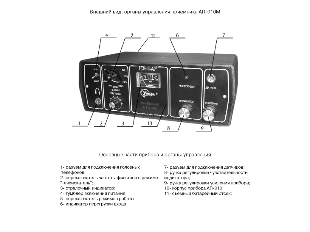 Успех АТ-207 имеет 4 режима работы, из которых 3 относятся к акустическому методу, а один предназначен для проверки заряда элементов питания. Режим «Широкой Полосы» (ШП) позволяет улавливать сигналы в максимально большом диапазоне. Режимы «Фильтр низких частот» (ФНЧ) и «Полосовой фильтр» (ПФ) рассчитаны на поиск течей в условиях значительных помех, а «Контроль питания» (КП) носит сугубо технический характер, поскольку создан исключительно для определения состояния аккумуляторов (подробнее о режимах работы в пунктах 2.1 и 2.3 руководства по эксплуатации).