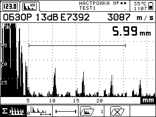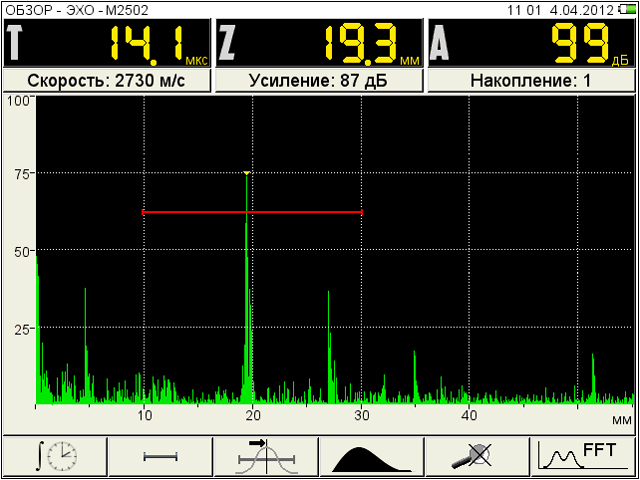 | Представление сигнала в реальном масштабе времени. Предусмотрены возможности выполнения следующих способов измерений: по максимуму сигнала в стробе, по первому превышению сигналом уровня строба, сложения всех сигналов в стробе (функция АКФ). На экране прибора представлена рабочая область А-скана сигнала и основные параметры измерений – время ультразвука, глубина несплошности, амплитуда сигнала. |