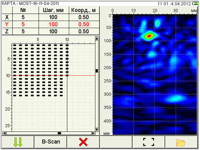 Режим КАРТА предназначен для формирования набора изображений сечений объекта контроля, перпендикулярных к поверхности при сканировании антенной решеткой вдоль ранее размеченных линий с постоянным шагом, т.е. набор параллельных лент, ограниченных по протяженности. Задавая шаг сканирования по вертикали и по горизонтали, можно получить представление о внутренней структуре всего объекта. |
