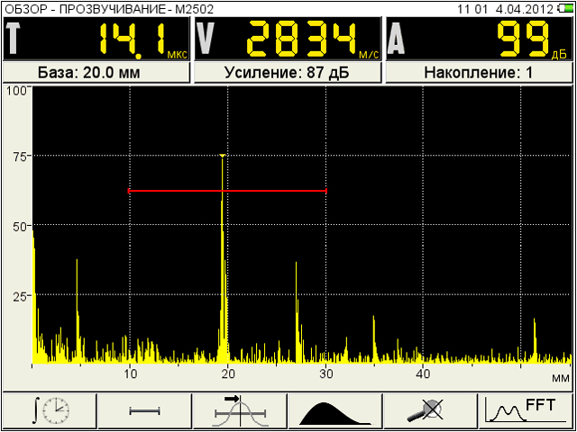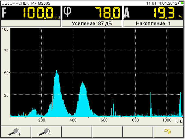 | Основное применение данного режима – оценка общих физико-механических свойств материала (затухание, пористость и пр.). С помощью изменения составляющих спектра принятого сигнала к спектру излученного сигнала можно судить о характеристиках внутренней структуры исследуемого материала. На экране прибора представлена область спектра сигнала и основные параметры измерений – частота и фаза сигнала, его амплитуда. |