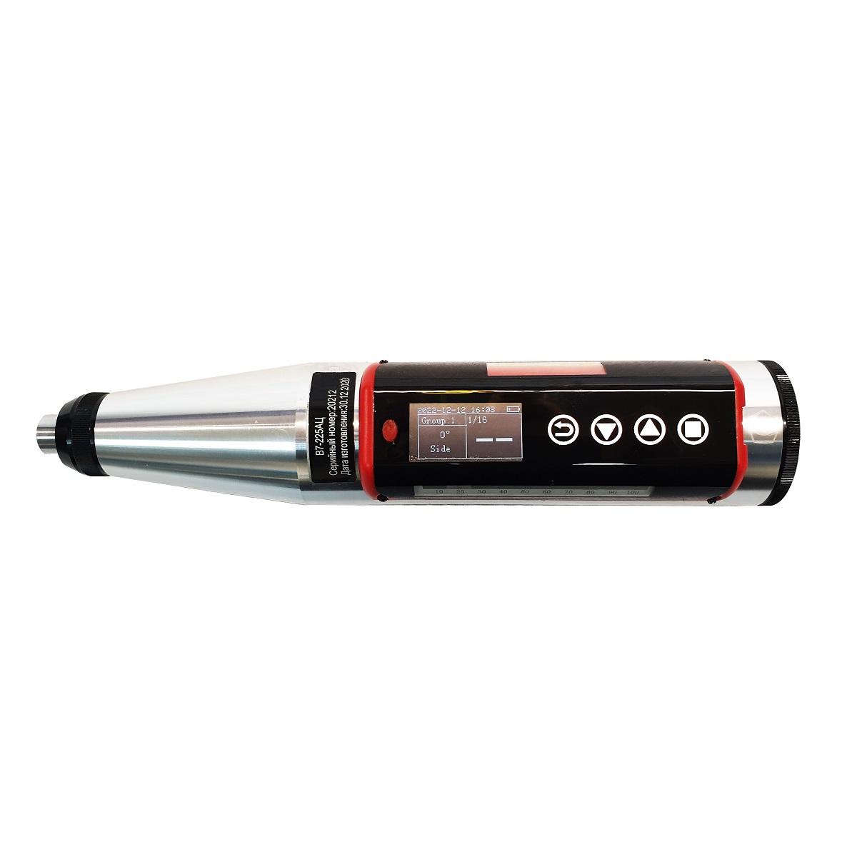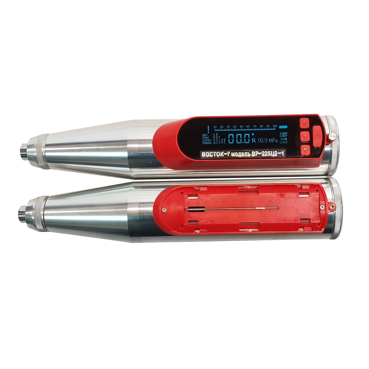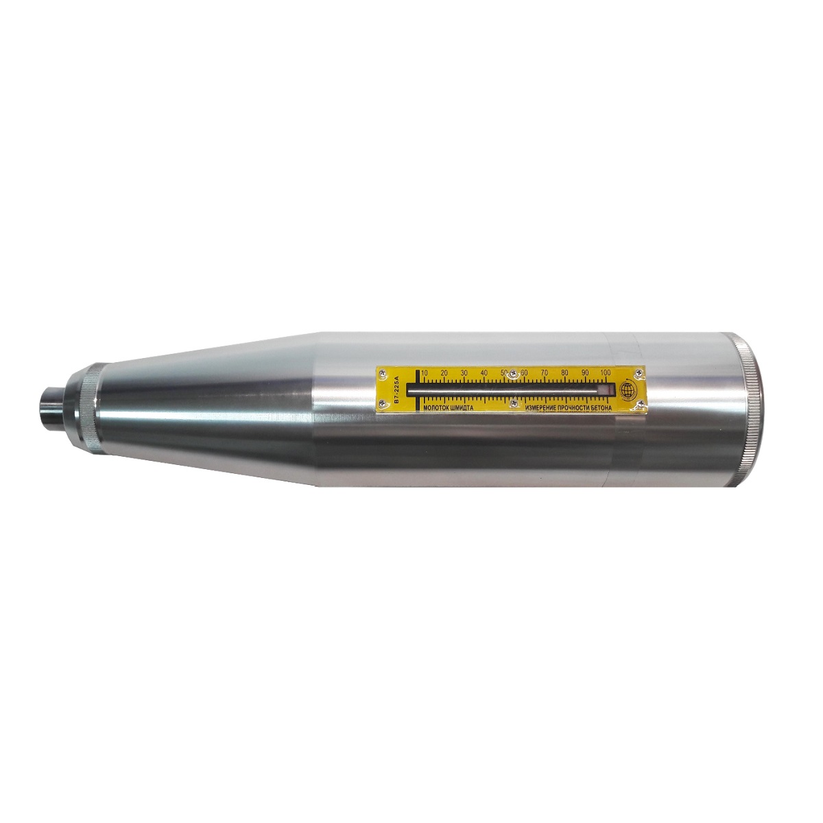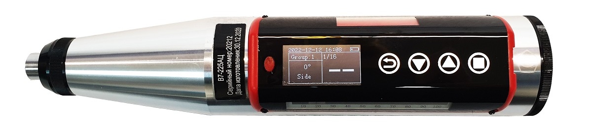 В7-225А — модель с аналоговым индикатором (шкалой). Значение отскока R считывается по шкале и переводится в значение прочности на сжатие (МПа) с помощью таблиц, приведенных в руководстве по эксплуатации. Поскольку направление и угол удара могут влиять на полученные показания, на корпусе молотка приведены поправочные таблицы для измерений на горизонтальных и наклонных поверхностях.