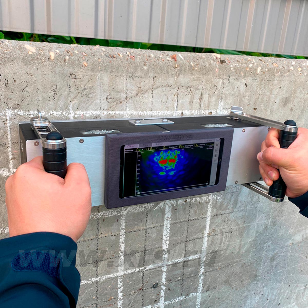 Ультразвуковой контроль бетонных и железобетонных конструкций осложняется тем, что поверхность бетона — грубая и пористая — не позволяет добиться приемлемого акустического контакта с преобразователем через жидкость. Томограф A1040 MIRA 3D работает без контактной жидкости, так как его антенная решетка состоит из активных преобразователей с сухим точечным контактом (технология А-СТК) с улучшенным соотношением сигнал/шум.