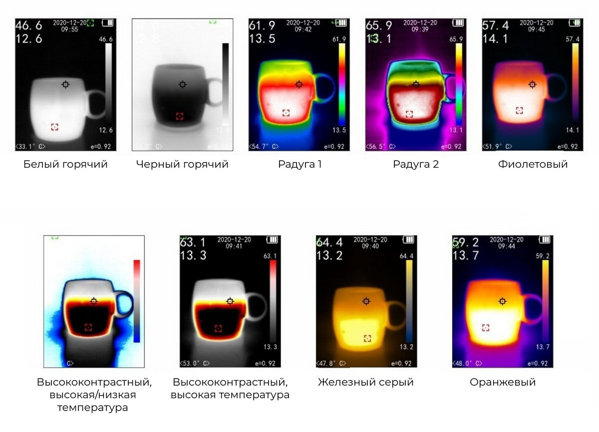 белый горячий, черный горячий, радуга 1, радуга 2, фиолетовый, оранжевый, железный серый, высокая температура высококонтрастный, высокая/низкая температура высококонтрастный |