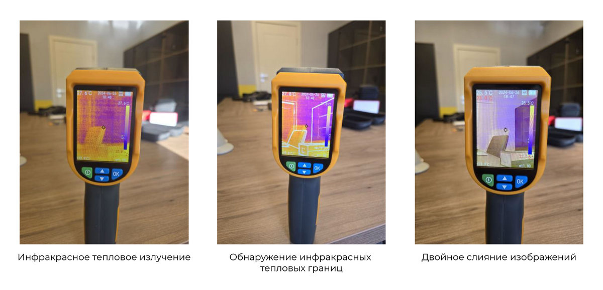 Термограмма может отображаться на экране в трех режимах: инфракрасное изображение, обнаружение инфракрасных тепловых границ, двойное слияние изображений (слияние инфракрасного и видимого изображения).