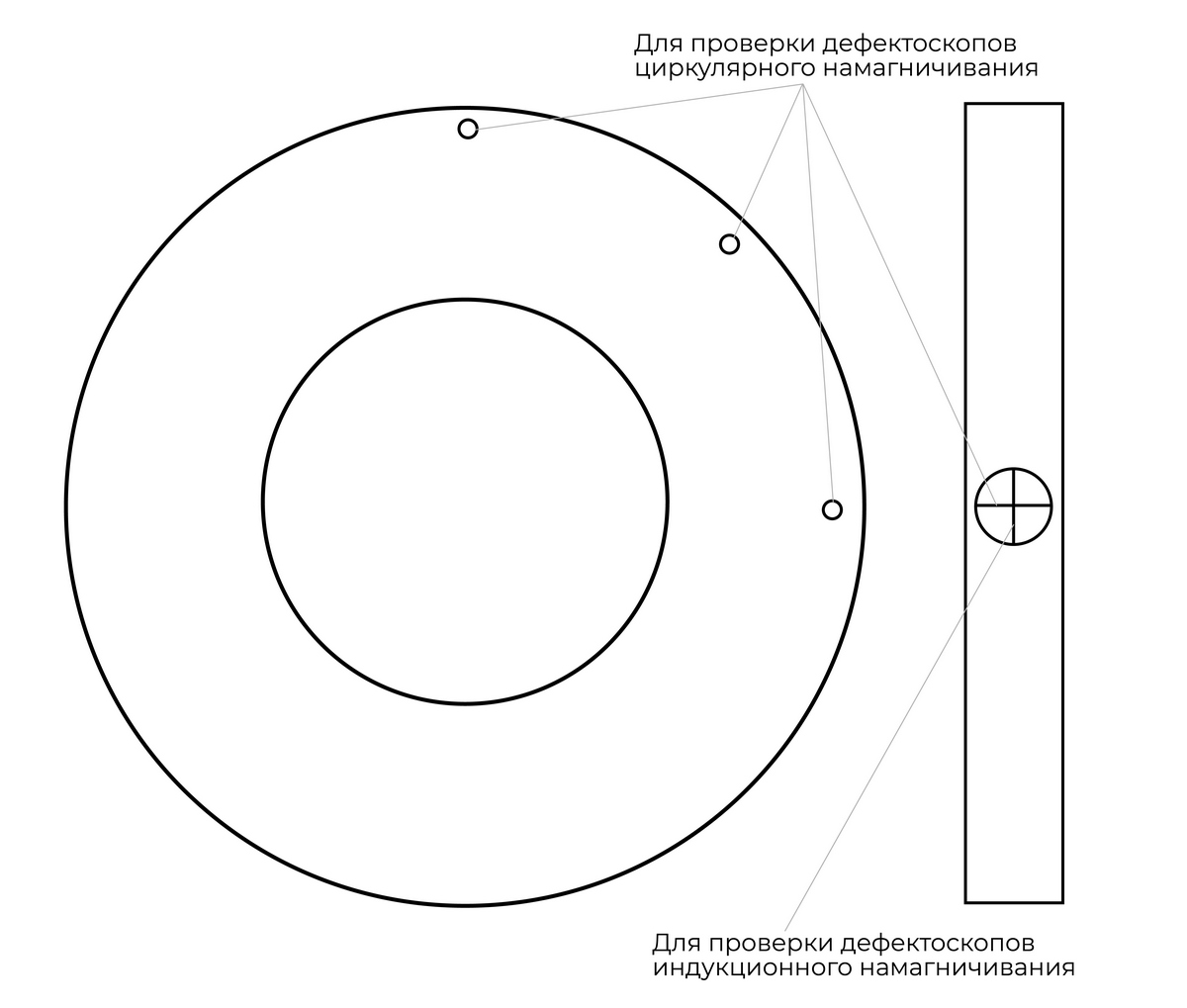 Образец МО-4 представляет собой диск диаметром 120 мм и высотой 15 мм. На образце имеются дефекты 2 типов: поверхностные дефекты в виде трещин и 3 подповерхностных дефекта диаметром 2,5 мм.
