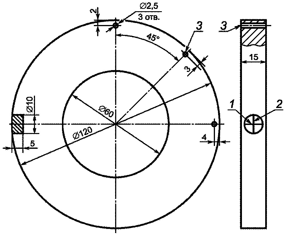 Размеры контрольного образца МО-4. 1, 2 — поверхностные дефекты; 3 — подповерхностные дефекты