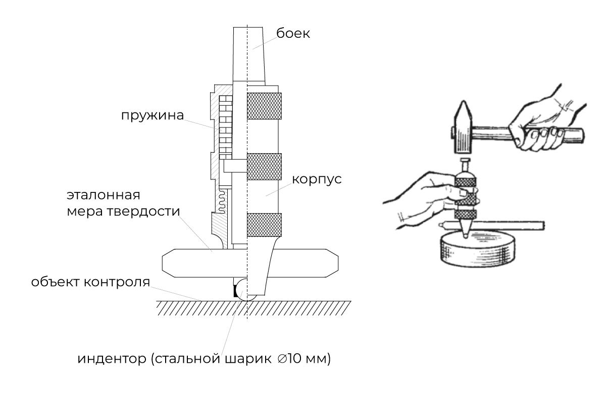 Твердомер Польди используется для измерения твердости металлов по Бринеллю. Измерения основаны на методе двойного ударного отпечатка. Работа твердомера построена так, что после удара молотком отпечаток индентора остается сразу и на объекте контроля, и на эталонной мере твердости.