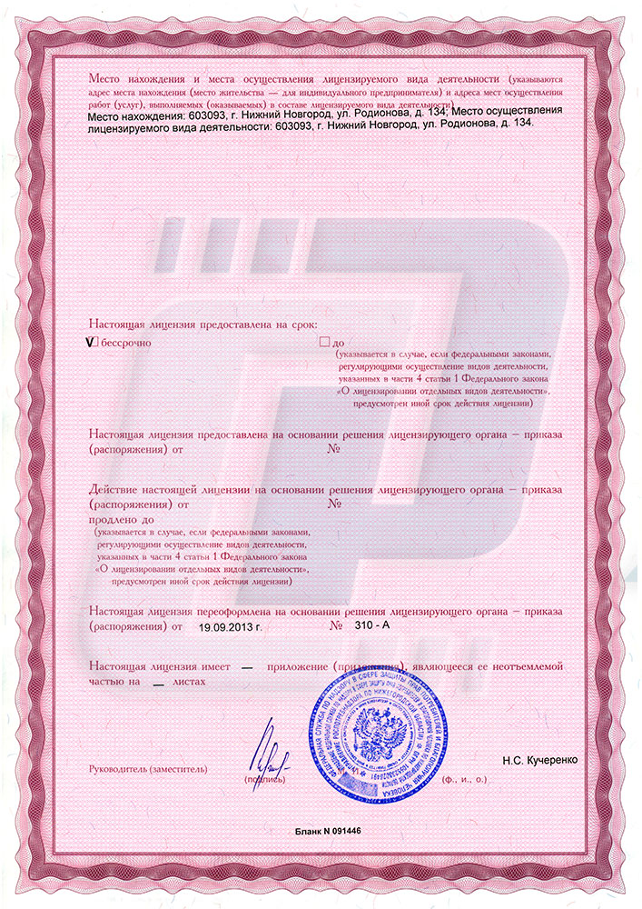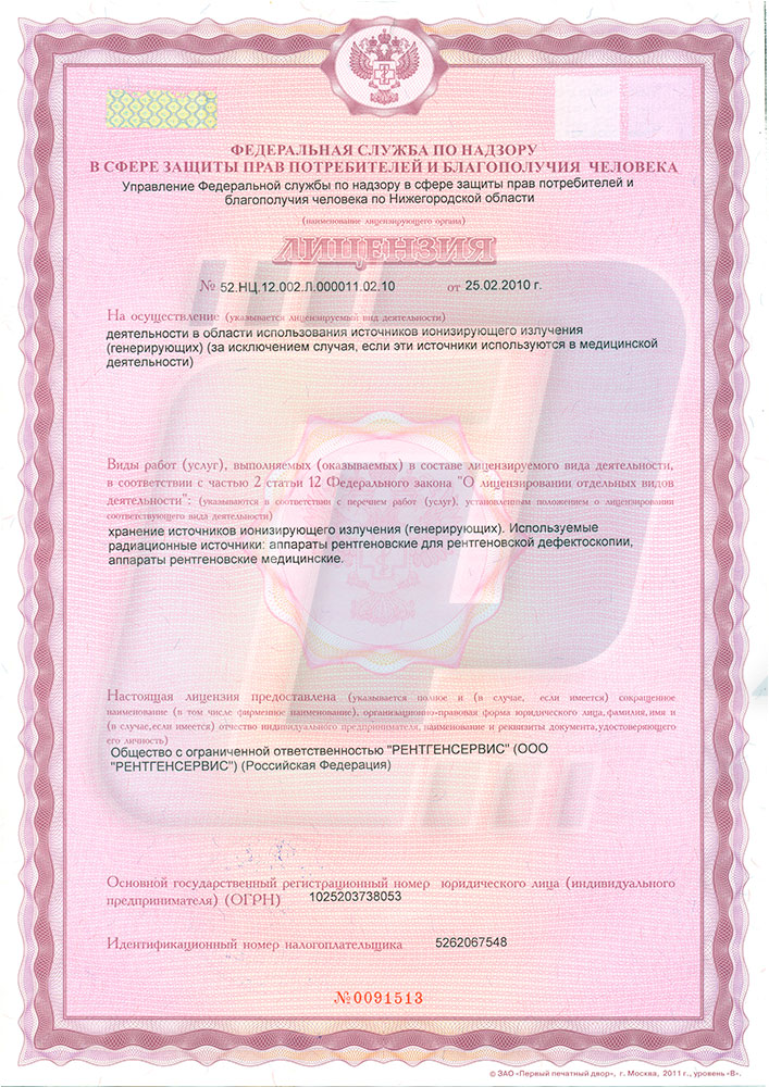 Лицензия компании «Рентгенсервис» на осуществление деятельности в области использования источников ионизирующего излучения (генерирующих) (за исключением случая, если эти источники используются в медицинской деятельности).