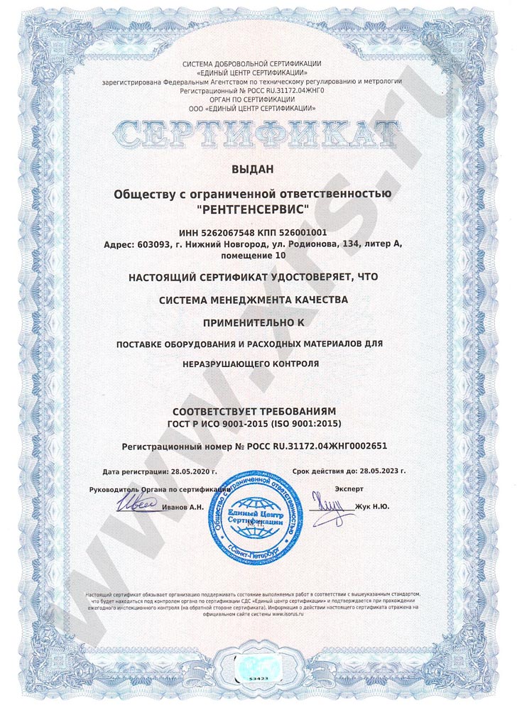 Сертификат выданный ООО «РЕНТГЕНСЕРВИС», удостоверяющий, что система менеджмента качества применительно к поставке оборудования и расходных материалов для неразрушающего контроля соответствует требованиям ГОСТ Р ИСО 9001-2015 (ISO 9001:2015). Регистрационный номер № РОСС RU.31172.04ЖНГ000440А.