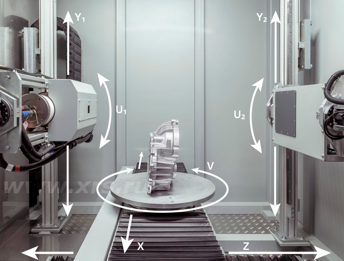 Два независимых манипулятора обеспечивают вертикальное перемещение рентгеновского излучателя и плоскопанельного детектора (оси Y1 и Y2), а также их наклон относительно горизонтальной плоскости на ±30° (оси U1 и U2).