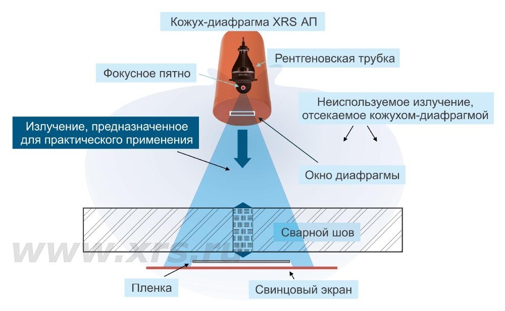 Кожух-диафрагмы XRS АП используются при фронтальном просвечивании труб импульсными рентгеновскими аппаратами серий АРИОН, АРИНА и ПАМИР. Применение диафрагм в рентгенографии решает две основные задачи: