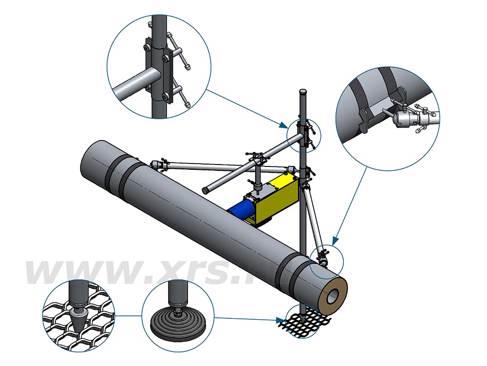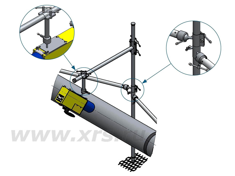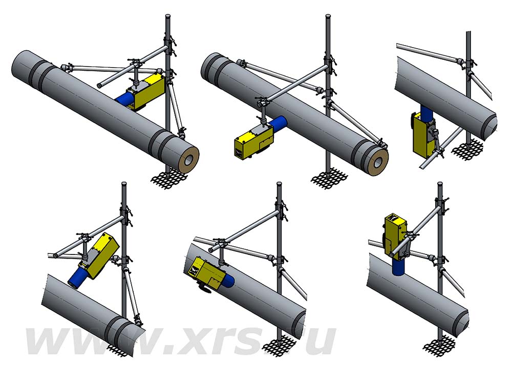 Конструкция штатива обеспечивает широкий диапазон вариантов установки рентгеновского аппарата в стеснённых условиях при плотном расположении трубопроводов и вспомогательных элементов конструкций, таких как металлические лестницы, эстакады и ограждения.