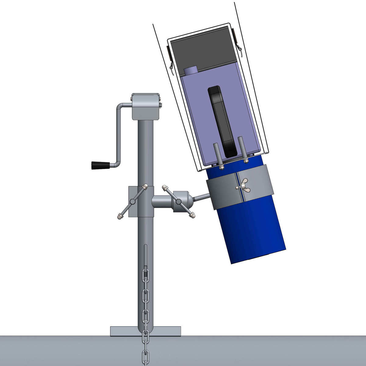 Штатив представляет собой стойку с основанием. Основание прижимается к трубе с помощью цепи, натяжение которой обеспечивается вращением рукоятки редукторного устройства. По стойке перемещается подвижная муфта, которая имеет механизм фиксации. На муфте размещен держатель с шаровым механизмом.