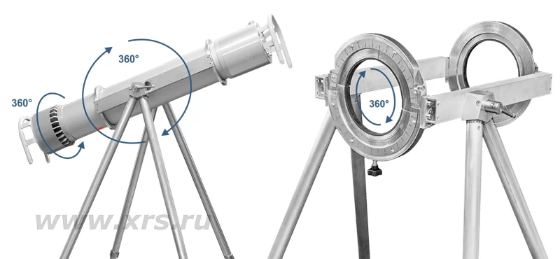 В зависимости от модели аппарата используются разные диаметры обжимных полуколец. Телескопические алюминиевые ноги штатива позволяют осуществлять регулировку положения рентгеновского аппарата по высоте. Регулировка положения аппарата в вертикальной плоскости и вокруг своей оси возможна в диапазоне 0 ÷ 360 градусов. Для отсчета угла поворота рентгеновского аппарата вокруг своей оси предусмотрена круговая шкала.