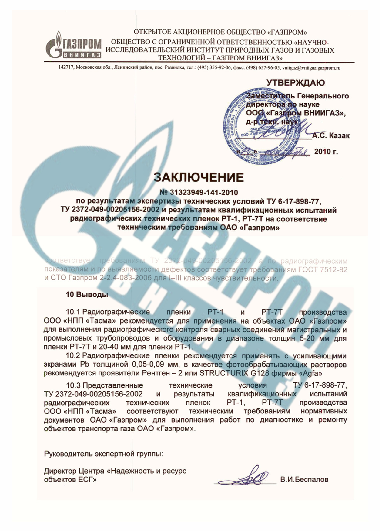 Пленка РТ-1 соответствует техническим требованиям СТО Газпром 2-2.4-083-2006 и рекомендована ООО «Газпром ВНИИГАЗ» для применения на объектах ОАО «Газпром».