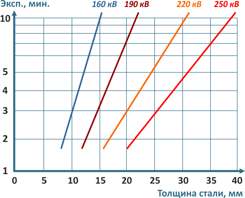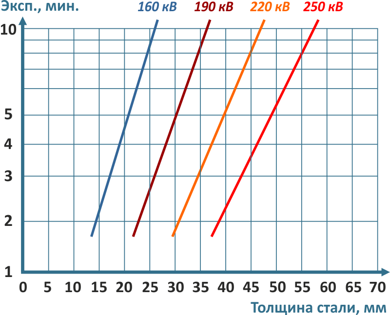 Напряжение на рентгеновской трубке и время экспозиции устанавливаются исходя из толщины стали объекта просвечивания, фокусного расстояния и оптической плотности, которую необходимо получить на снимке. На рисунках показана зависимость этих показателей для рентгенаппарата МАРТ-250 при использовании высокочувствительных рентгеновских плёнок AGFA с усиливающими экранами. Для того, чтобы обеспечить необходимую чувствительность контроля, сократить время экспозиции в целях экономии ресурса термоэмиссионной трубки рекомендуется применять рентгеновскую плёнку AGFA F8 с флуорометаллическим усиливающим экраном RCF (рекомендована для применения на объектах ОАО «Газпром»). Когда требуется более высокая чувствительность контроля, рекомендуется применять плёнку AGFA D7 со свинцовыми экранами (соответствует требованиям РД-25.160.10-КТН-016-15 ОАО «АК «Транснефть», рекомендована к применению на объектах ОАО «Газпром»), устанавливая при этом минимальное напряжение на аноде, выбирая приемлемое время экспозиции по номограмме.