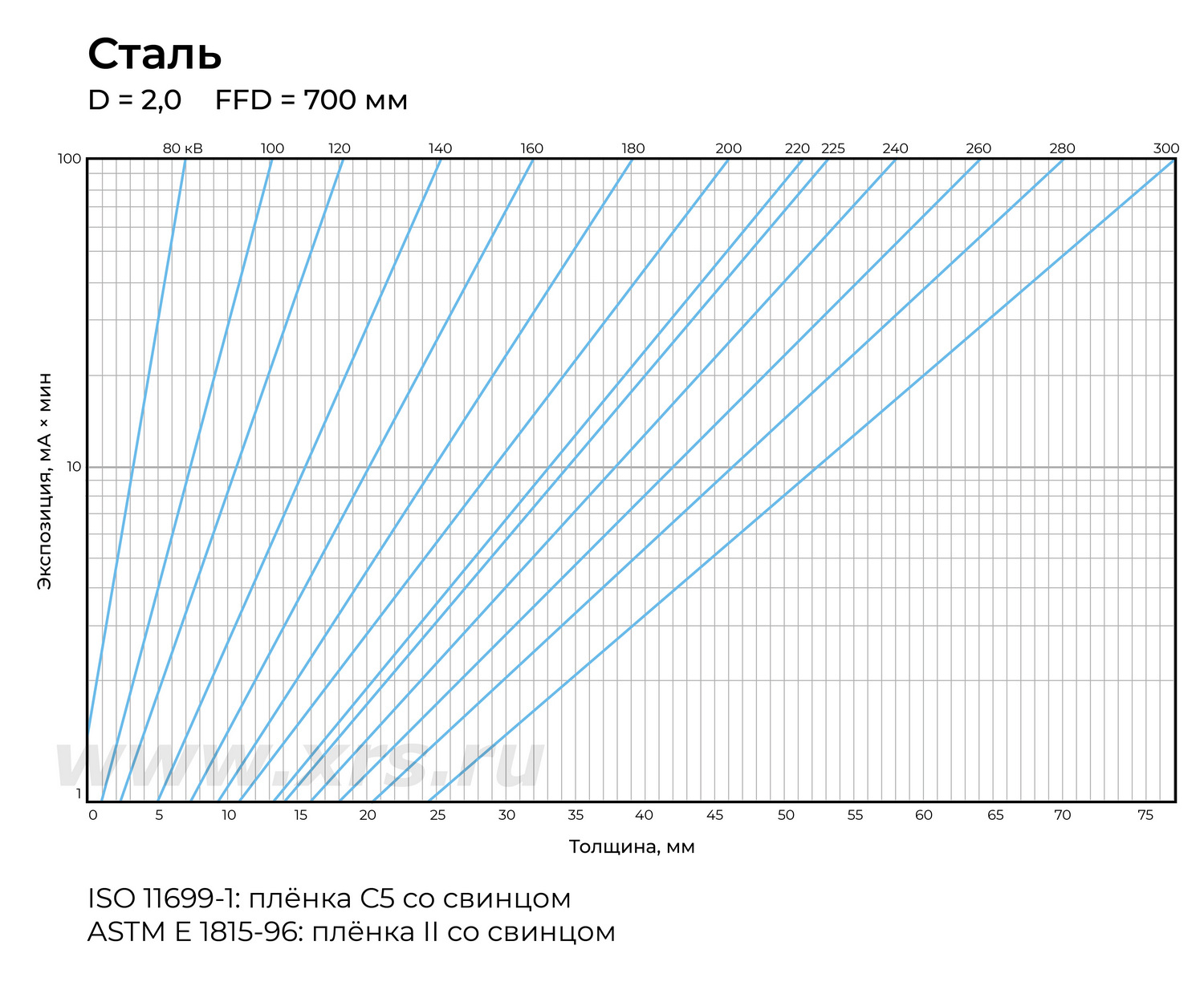 | Толщина стали, доступная для просвечивания, мм (время экспозиции 10 мин, пленка AA400, фокусное расстояние 700 мм, плотность снимка 2,0) |