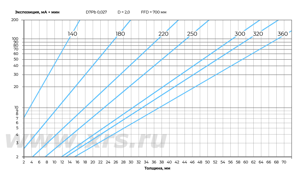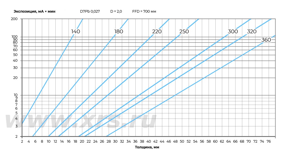 В качестве примера ниже приведены номограммы экспозиций для панорамных и направленных рентгеновских аппаратов Site-X (просвечивание стали).