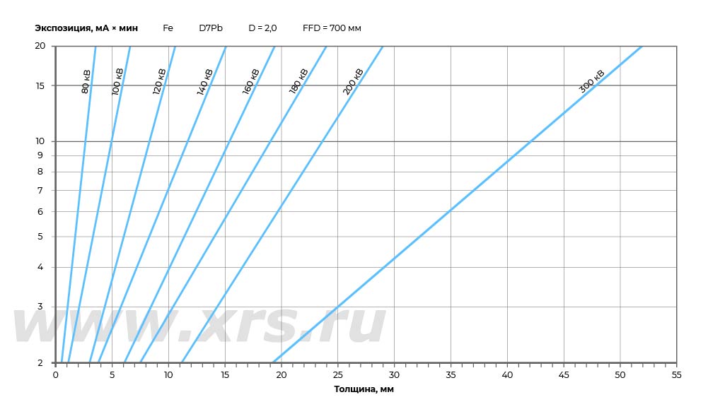 Ниже приведена номограмма экспозиций для рентгеновского аппарата ЭРА 52П при использовании высокочувствительной пленки AGFA D7 Pb.