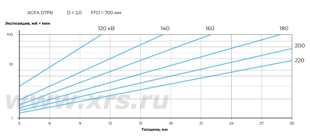 Ниже приведена номограмма экспозиций для рентгеновского аппарата РАП 220-5 для просвечивания по стали при использовании высокочувствительной пленки AGFA D7 с усиливающим свинцовым экраном 0,05–0,09 мм.