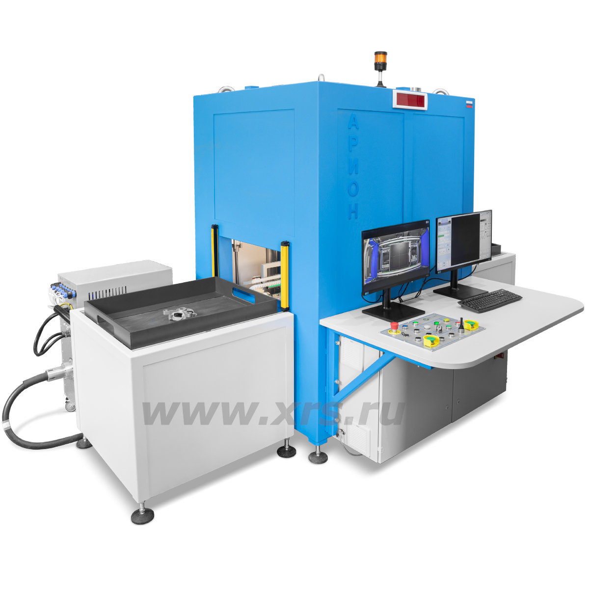 Внутри рентгенозащитной камеры установлены рентгеновская трубка, плоскопанельный детектор и видеокамера для наблюдения за процессом контроля. Два автоматизированных манипулятора обеспечивают синхронное перемещение рентгеновской трубки и детектора по горизонтальной оси.