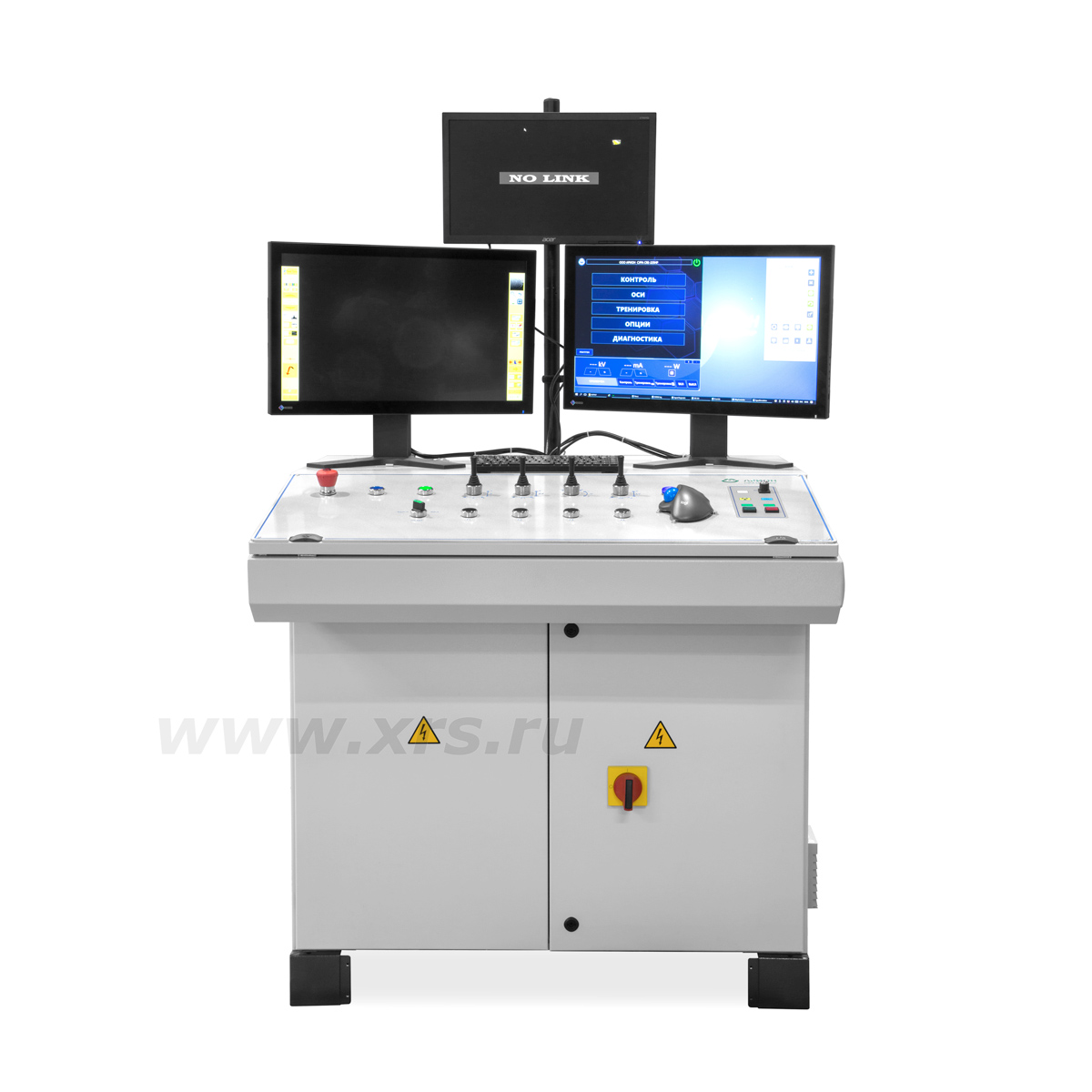 Управление работой комплекса осуществляется со стойки управления, которая монтируется за пределами камеры. Стойка оснащается тремя мониторами: на первом отображается рентгеноскопическая информация, второй связан с системой позиционирования и прицеливания, на третий выводится информация с видеокамер, расположенных внутри рентгенозащитной камеры.
