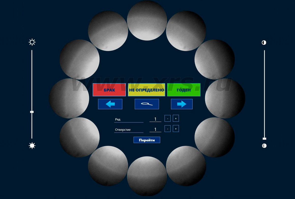Специально разработанное программное обеспечение СУРА, служащее для управления всеми элементами системы, осуществляет работу комплекса в автоматическом и ручном режимах, а также обеспечивает расшифровку результатов контроля. В программе создается виртуальный макет трубной доски, который с помощью процедуры калибровки привязывается к реальному объекту контроля. Оператор выбирает кольцевую линию и номера отверстий, которые необходимо просветить, после чего запускается автоматический процесс контроля. Манипулятор подъезжает к заданным отверстиям и делает необходимое количество снимков. Просвеченные отверстия помечаются на макете желтым цветом. Оператор, кликнув на них, открывает полученные снимки и принимает решение о годности или браке соединения.