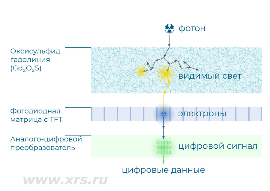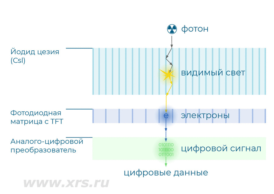 Корпус детектирующего блока выполнен из металла или прочного пластика и имеет карбоновое покрытие рабочей области. Питание панели предусмотрено от сети переменного тока, связь с компьютером осуществляется двумя UTP кабелями, которые обеспечивают высокую скорость передачи данных. Для преобразования рентгеновского излучения в аналоговый световой сигнал используются сцинтилляторы на основе оксисульфида гадолиния (Gadоx) или на основе соединения йодида цезия (CsI). Дальнейшее преобразование света в электроны производится матрицей, состоящей из полупроводникового материала – аморфного кремния (a-Si), и тонкоплёночных транзисторов (TFT), представляющих из себя полупроводниковые элементы, передающие электрический заряд на аналого-цифровой преобразователь. АЦП проводит измерение тока, полученного с транзистора, преобразовывая электрический сигнал в цифровой для последующей передачи информации на персональный компьютер оператора, разрядность аналого-цифрового преобразователя позволяет получать высококачественное изображение в диапазоне до 65 536 оттенков серого. Далее, с помощью специализированного программного обеспечения Стражник формируется файл защищенного расширения DICONDE, доступного для последующей обработки и анализа.