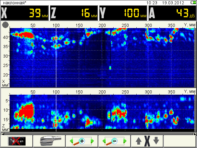 Томограф — визуализация внутренней структуры объекта контроля (В-скан) в реальном времени. Режим дает возможность определять ориентацию дефектов, измерять их размеры, расстояния между ними и пр.