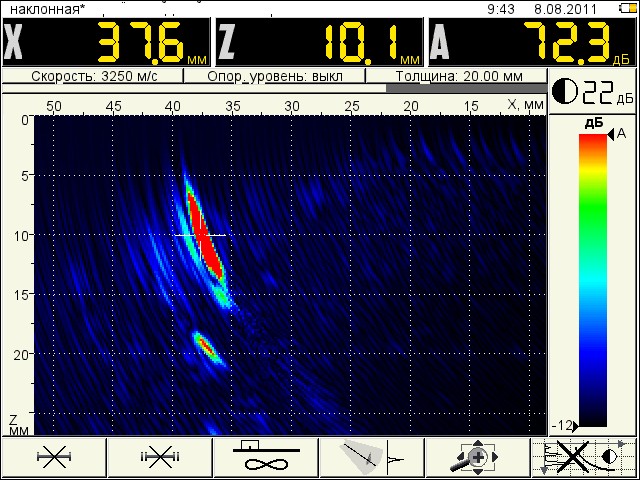 Дефектоскоп — работа в качестве классического дефектоскопа с наклонными и прямыми преобразователями. Сигналы выводятся на экран в виде А-скана.