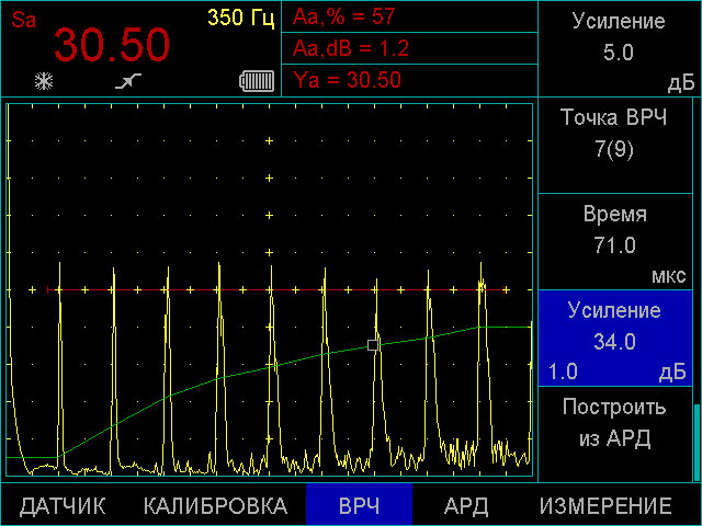 2) Функции временной регулировки чувствительности (ВРЧ) и построения кривых «амплитуда-расстояние» (АРК), предназначенные для оценки размеров дефектов на разной глубине залегания.