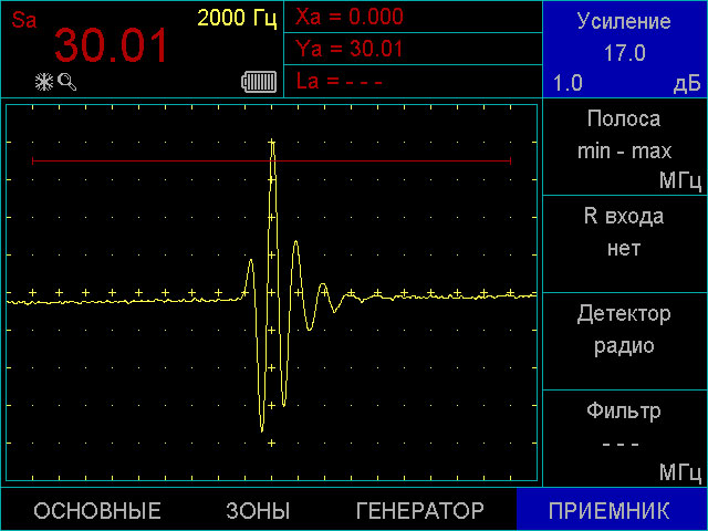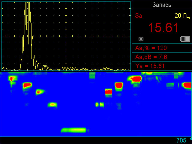 3) Возможность представления сигнала в недетектированном виде в реальном масштабе времени позволяет подробно изучить фазы сигналов, производить контроль на фоне больших структурных помех и разделять сигналы от близкорасположенных отражателей.