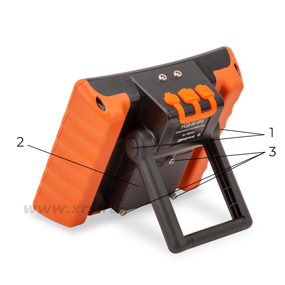 Корпус прибора выполнен из ударопрочного ABS-пластика. Степень защиты IP65 обеспечивает возможность работы с дефектоскопом в помещениях с повышенной влажностью или в дождливую погоду, а диапазон рабочих температур составляет от −30 до +55 °C. Особенность конструкции УСД-50 IPS — морозостойкий цветной TFT дисплей разрешением 640 × 480 точек. Дисплей снабжен антибликовым покрытием и будет отлично виден на солнечном свету.
