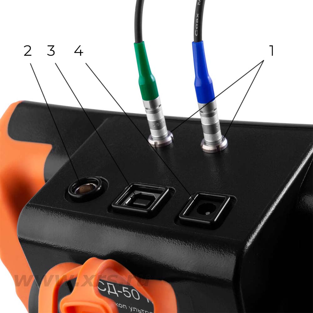 1 — Разъемы для подключения ультразвуковых преобразователей;