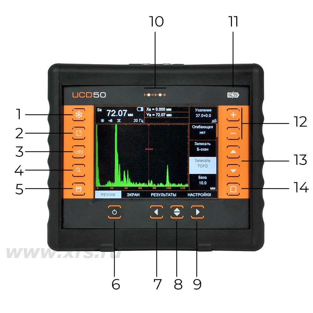 УСД-50 IPS отличает интуитивно-понятный интерфейс: управление прибором не создает сложностей даже у начинающих пользователей. Управление организовано через клавиши и систему меню, где все функции разбиты по группам. Структура меню позволяет изменять параметры работы под любую задачу и включает в себя главное меню (для настройки прибора перед контролем, например, изменения параметров генератора, усилителя, установки зон контроля и пр.) и дополнительное меню (для редких специфических регулировок: цветовой схемы экрана, установки даты, времени и пр.) Более подробно интерфейс управления дефектоскопа изображен на рисунке ниже.