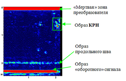 Данная сканограмма получена на трубе диаметром 1420 мм, длиной 2200 мм. В верхней части находится образ «мертвой» зоны преобразователя, ниже — образ, соответствующий дефекту типа «КРН», образы продольного шва и «оборотного сигнала» (сигнала, прошедшего по окружности трубы).