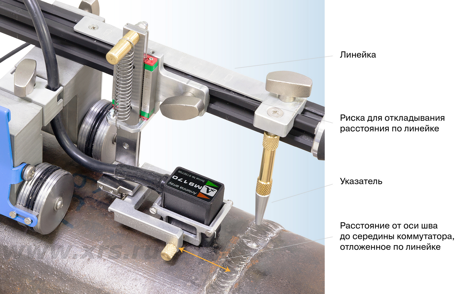 Сканер MS150 TuScan подходит для контроля сварных соединений на плоских объектах или на трубах диаметром от 57 мм. Сканер позволяет равномерно перемещать антенные решетки вдоль сварного шва, сохраняя стабильный акустический контакт, и соблюдать одинаковое расстояние относительно оси шва. Расстояние от оси шва до антенной решетки задается с помощью указателя, который выставляется над осью шва, и линейки указателя, по которой откладывается необходимое расстояние.