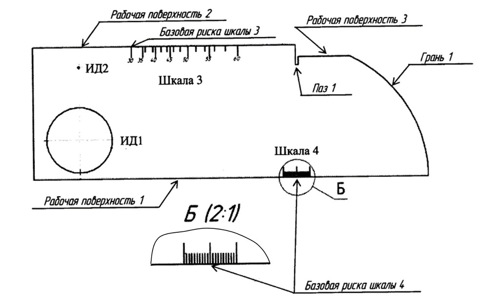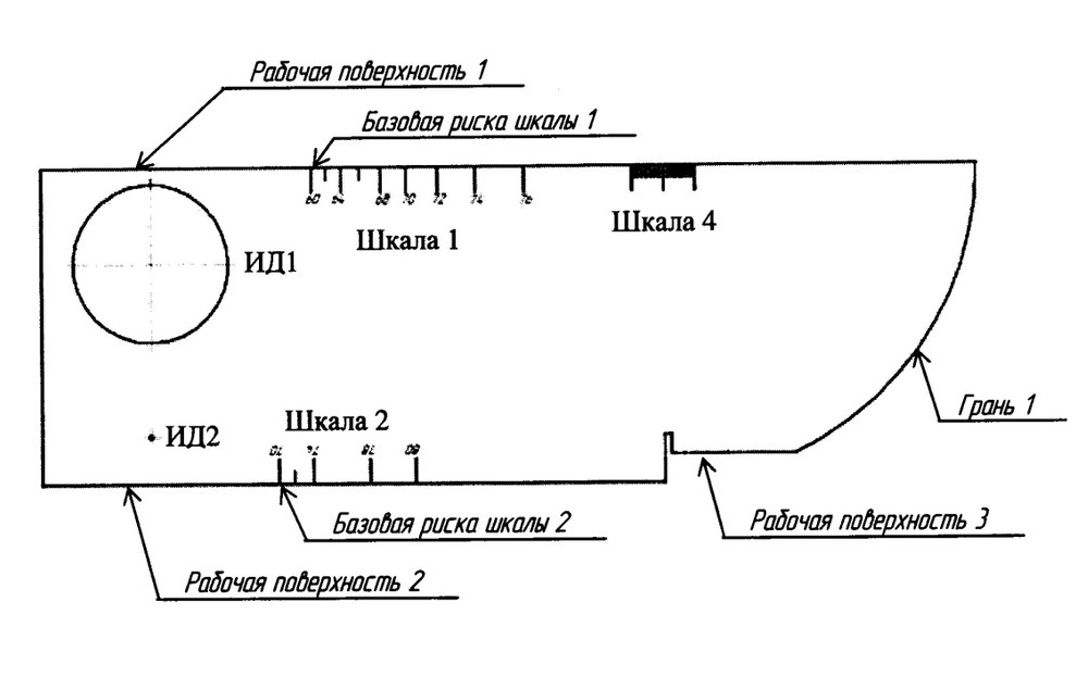 Положение рисок шкалы относительно базовой риски, мм: — для шкалы 1 вдоль рабочей поверхности 1 — для шкалы 2 вдоль рабочей поверхности 2 — для шкалы 3 вдоль рабочей поверхности 2 |