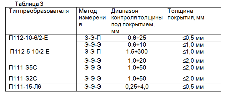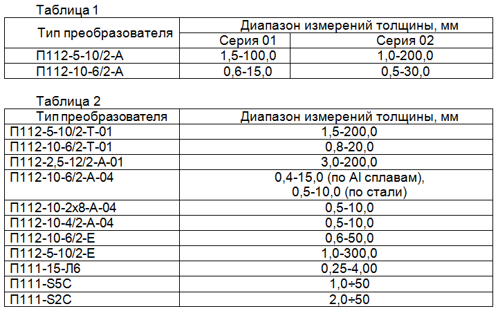 Диапазон контролируемых Булатом 3 толщин — от 0,25 до 300 мм с дискретностью 0,01; 0,1. Таблицы диапазонов измерения толщины для различных преобразователей, используемых совместно с толщиномером Булат-3. Таблицы диапазонов измерения толщины под покрытием.