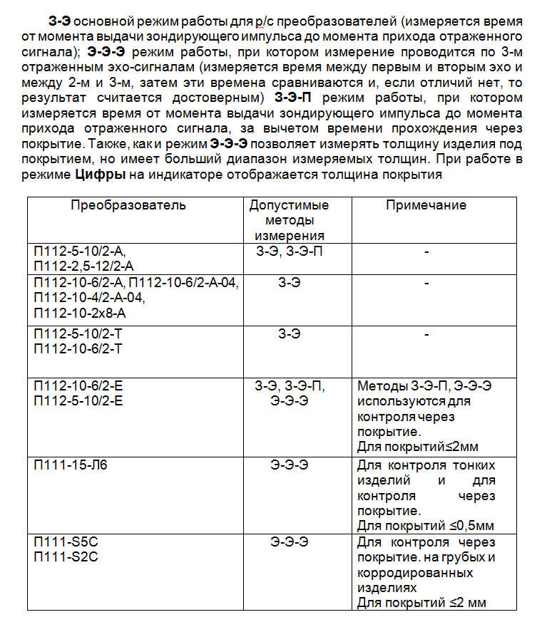 - Ультразвуковой импульсный эхо-метод измерения (режимы ЭХО-ЭХО-ЭХО, ЗОНД-ЭХО и ЗОНД-ЭХО-ПОКРЫТИЕ).