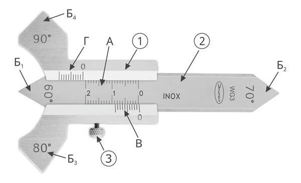 1 — рамка; 2 — измерительный движок; 3 — стопорное устройство; А — измерительная шкала; Б₁₋₄ — контрольные углы; В, Г — нониусы шкалы (А)