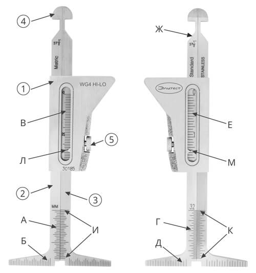 1 — рамка; 2, 3 — измерительные движки; 4 — контрольные зацепы; 5 — стопорное устройство движка (2) и (3); А, Б, В — метрические шкалы; Г, Д, Е — дюймовые шкалы; И, К — риски-индексы шкал (А) и (Г) соответственно; Л, М — контрольные указатели шкал (В) и (E) соответственно; Ж — контрольные углы