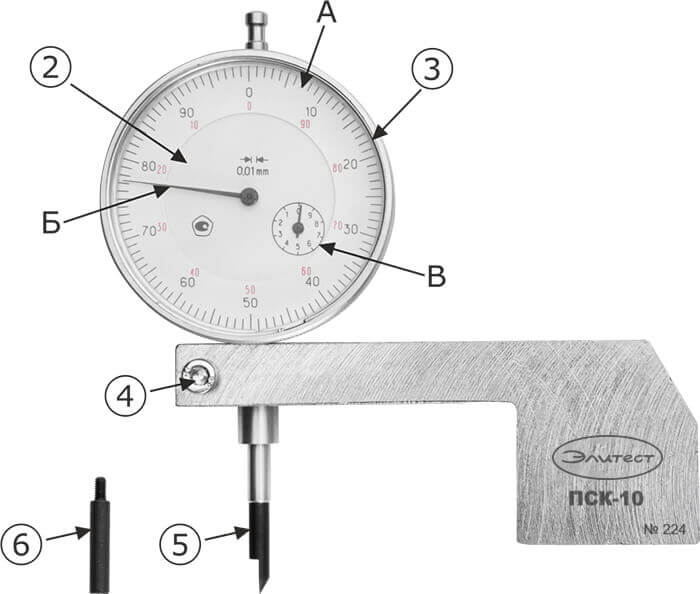 1 – опорный кронштейн; 2 – индикатор часового типа; 3 – поворотное кольцо циферблата для установки нулевого значения; 4 – стопорное устройство; 5 – острый измерительный наконечник; 6 – плоский измерительный наконечник; А – круговая шкала; Б – стрелка; В – указатель числа оборотов в мм